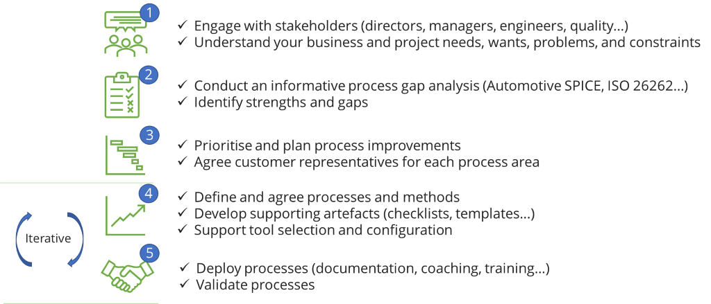 They partnered with 3SK on a process improvement project (PIP) to achieve state-of-the-art process maturity. We were engaged to define and deploy a set of lean processes which achieve Automotive SPICE™ Capability Level 3 (Extended VDA scope) and fully comply with the needs of ISO 26262. This included provision of all supporting artefacts, tool configurations, templates, checklists, guidelines, training, coaching, etc.